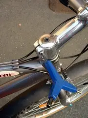 Si vous entendez un "tac" ou ressentez un léger jeu en poussant le vélo d’avant en arrière avec le frein avant bloqué, c’est probablement que la fourche bouge dans le tube de direction = réglage trop lâche.