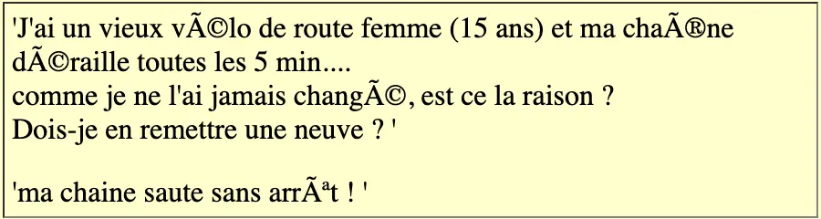la chaîne n'est-elle pas vrillée (un maillon est tordu) ? → voir fiche Réparation d'une chaîne de vélo.