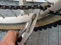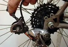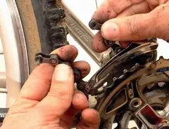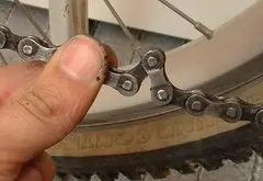 Mettre en place la chaîne sur le vélo sans oublier les dérailleurs. Commencer par l’extrémité "maillon intérieur" (voir fiche Chaîne, principes pour la nomenclature), en veillant que sur l’autre extrémité, l’axe du maillon soit bien tourné vers vous.
