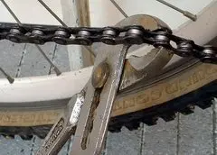 Comme on peut le voir sur la photo de droite, l’axe n’est pas encore bien en place. Il faut le dérive-chaîne pour finir le travail.
