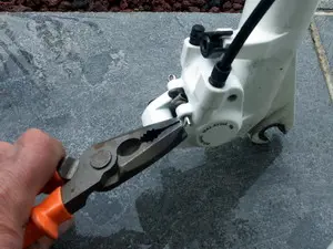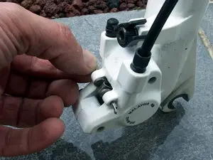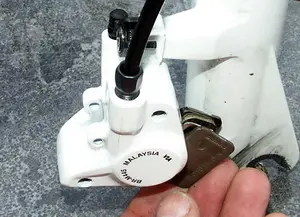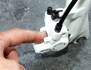 Tout d’abord, il n’est pas nécessaire de déposer l’étrier. Celui-ci peut rester sur le vélo. Pour travailler plus confortablement, et si le vélo s’y prête, retourner celui-ci.