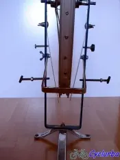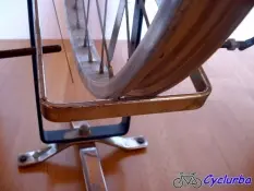 Installez la roue sur un support de centrage ou un pied d’atelier avec jauge.