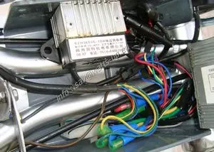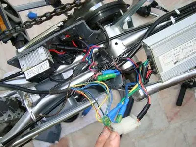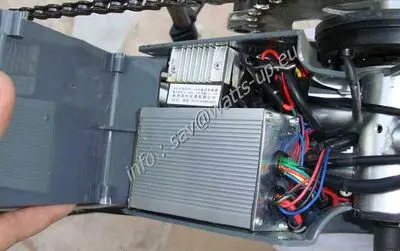 Commencez par inspecter le compartiment plastique gris sous la batterie : il contient les câbles de connexion et le variateur (le « cerveau électronique »).
