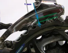 Mettre la manette en position 2 (plateau médian) : la fourchette doit être juste au-dessus du plateau, centrée sans toucher la chaîne.