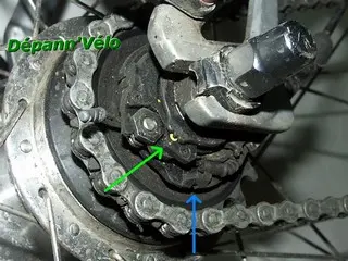 Une petite astuce pour reclipser l'entraîneur plus facilement : passer une tige fine (petit tournevis) dans l'orifice signalé par la flèche bleue, et ramener le disque de sélecteur vers le bas.